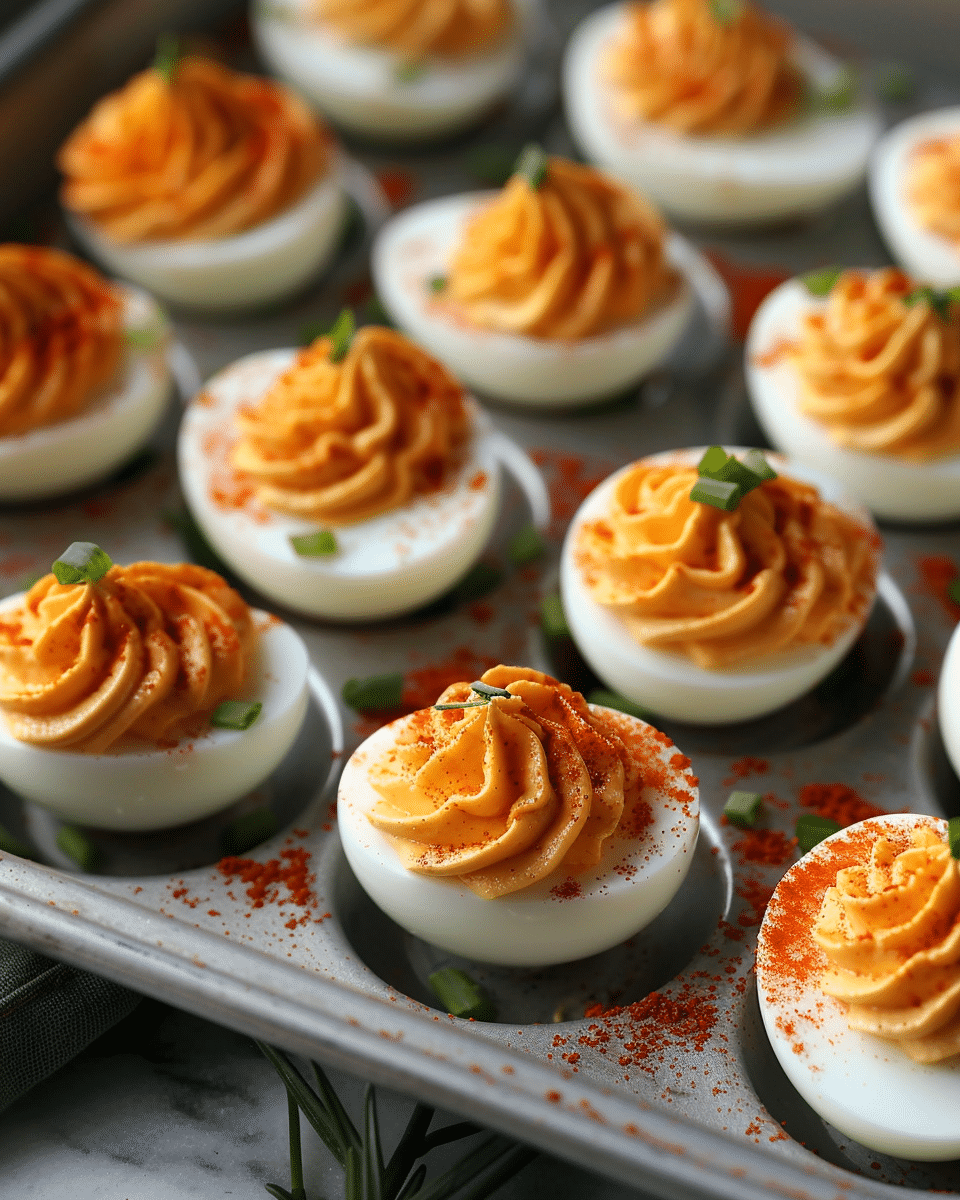 I store leftover deviled eggs in an airtight container in the refrigerator for up to 2 days. I avoid stacking them to keep the decorations intact. I don’t recommend reheating these—they’re best served cold or at room temperature.