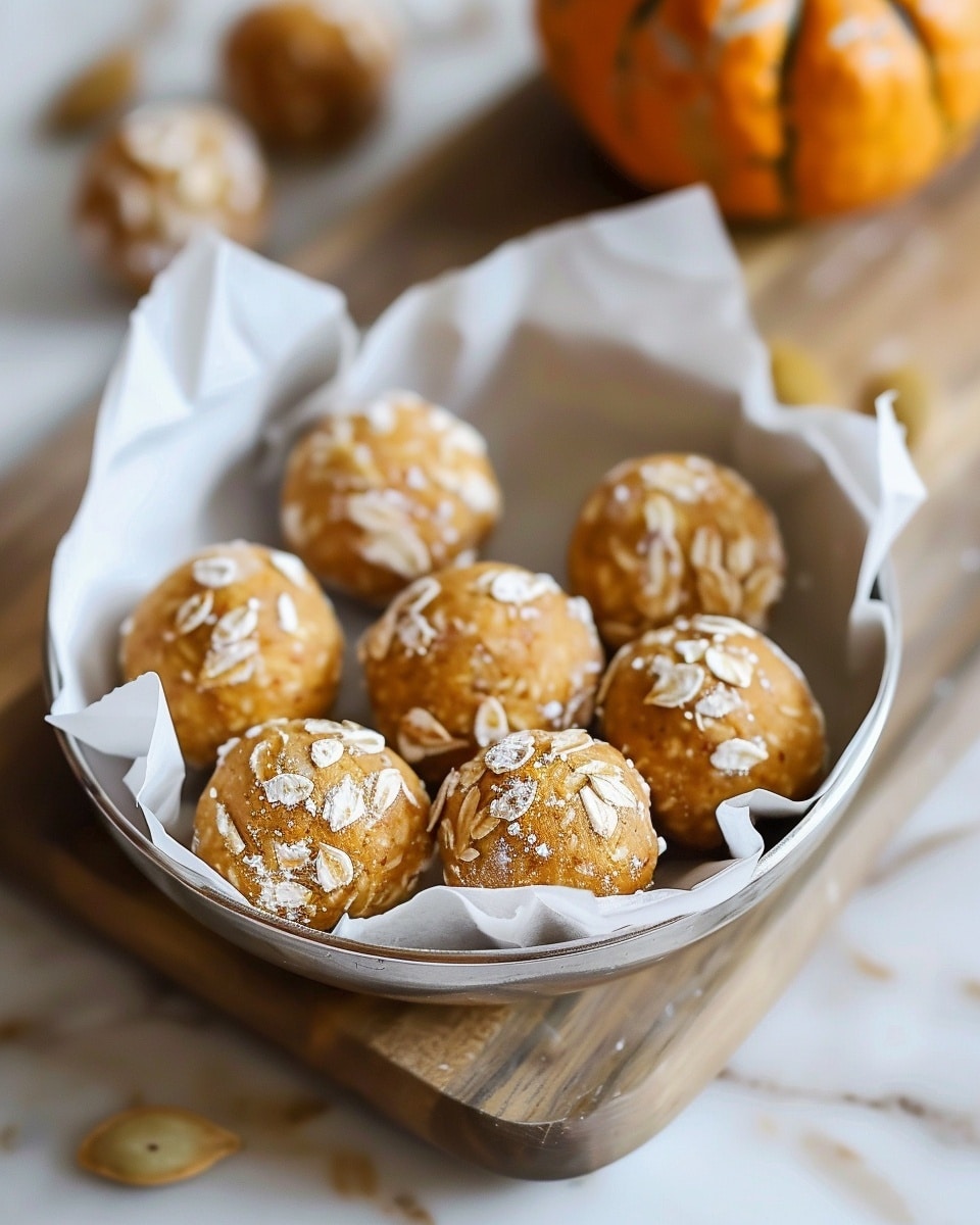 If the mixture feels too dry, I add a little more pumpkin puree or nut butter. If it’s too wet, I add extra oats or protein powder. Chilling helps them firm up and hold shape.