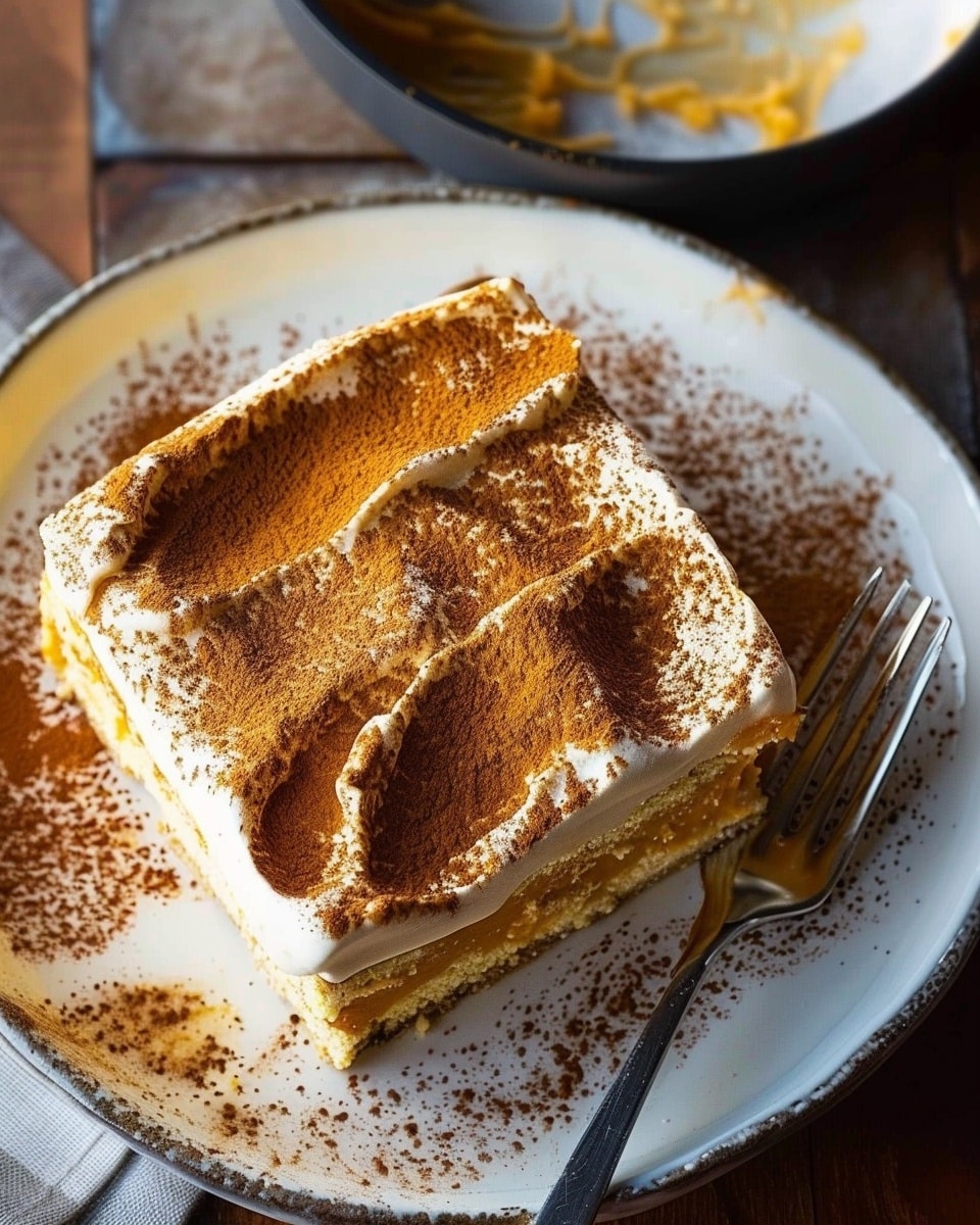 This Pumpkin Tiramisu is a creamy, no-bake fall dessert that layers espresso-soaked ladyfingers with pumpkin-spiced mascarpone cream. Easy to make ahead and perfect for Thanksgiving, it’s a cozy, festive twist on the classic Italian tiramisu.