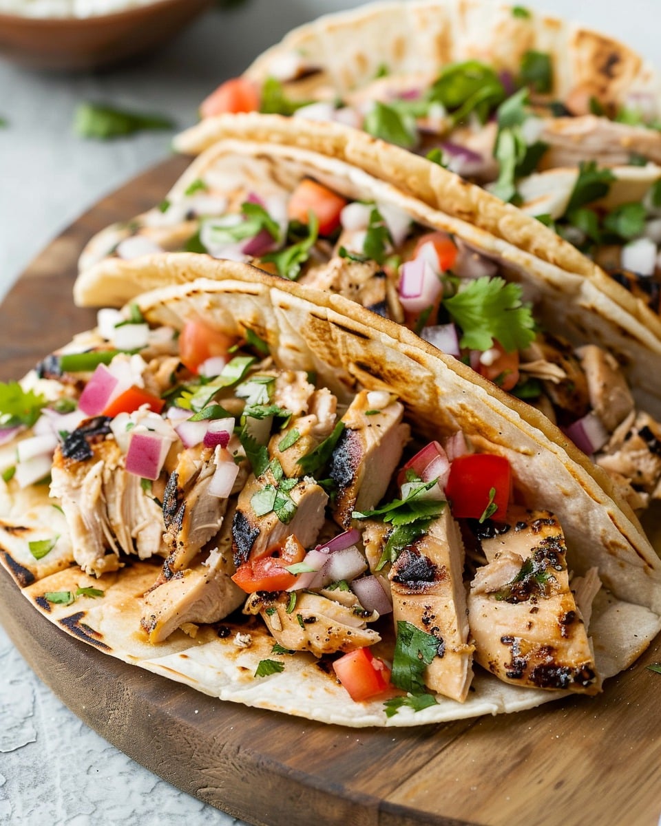 Fresh and flavorful Mediterranean chicken tacos made with juicy seasoned chicken, crisp vegetables, and a creamy yogurt sauce, all wrapped in soft tortillas.
