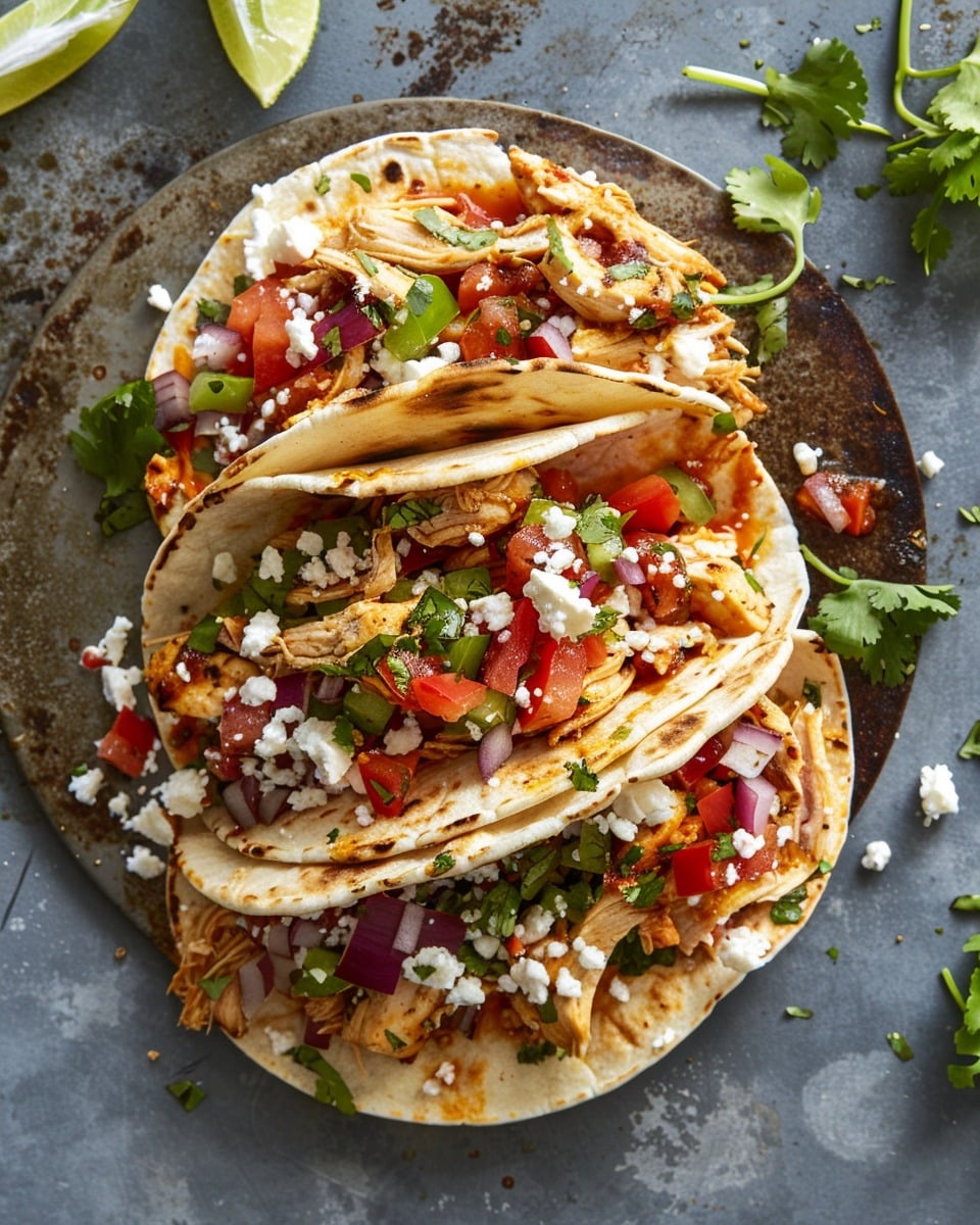 I store the components separately in airtight containers in the refrigerator for up to 3 days. When reheating, I warm the chicken and tortillas, then assemble fresh to keep everything crisp and flavorful.