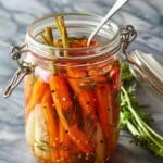 This recipe fills about 2 pint-sized jars and makes around 6 to 8 servings. It takes just 10 minutes to prep and another 5 minutes to heat the brine. The carrots are ready to eat in 1 hour, but they taste even better after a full day in the fridge.