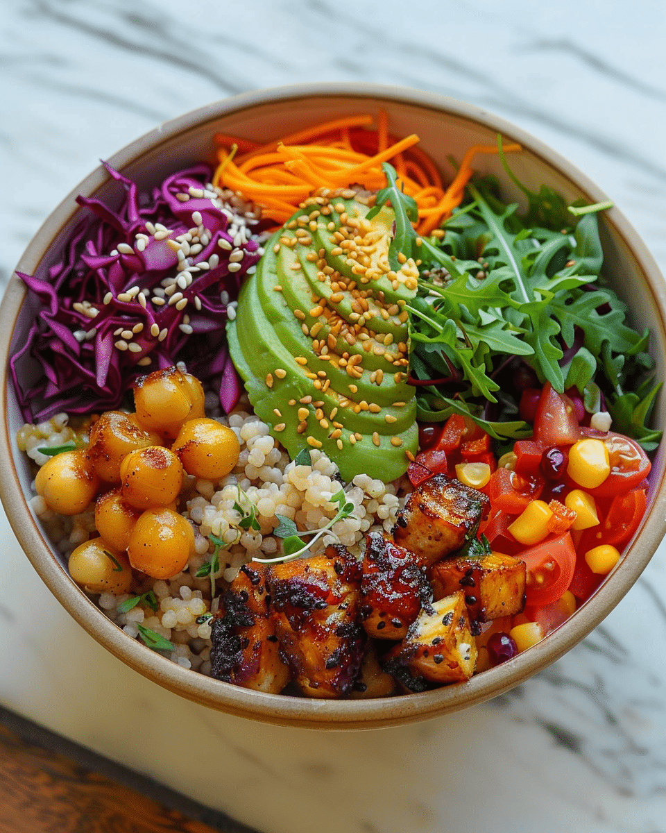 I often switch up the protein—sometimes I use grilled tofu, tempeh, or even a soft-boiled egg. For grains, I love trying farro or couscous as alternatives. If I want a punchier flavor, I use a creamy peanut or ginger-sesame dressing. Roasted sweet potatoes or beets are another favorite add-in for extra color and taste.