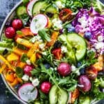 I enjoy making this rainbow spring salad when I want something colorful, refreshing, and full of life. It brings together crisp vegetables, vibrant textures, and a light champagne vinaigrette that ties everything together beautifully.