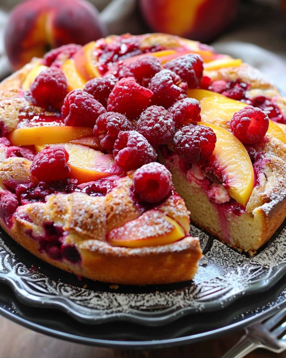 Raspberry Peach Greek Yogurt Cake is a tender, moist, and fruity dessert featuring the bright flavors of raspberry and peach, balanced with the tang of Greek yogurt. It’s simple to make and perfect for brunch, tea time, or a light dessert.