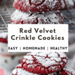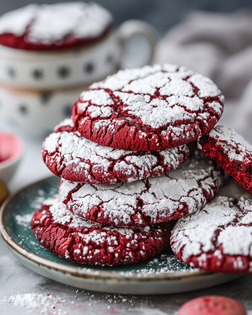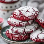 Red Velvet Crinkle Cookies are soft, fudgy cookies with a hint of cocoa and a striking red hue, rolled in powdered sugar that creates a beautiful crackled finish. Perfect for holidays or special occasions.