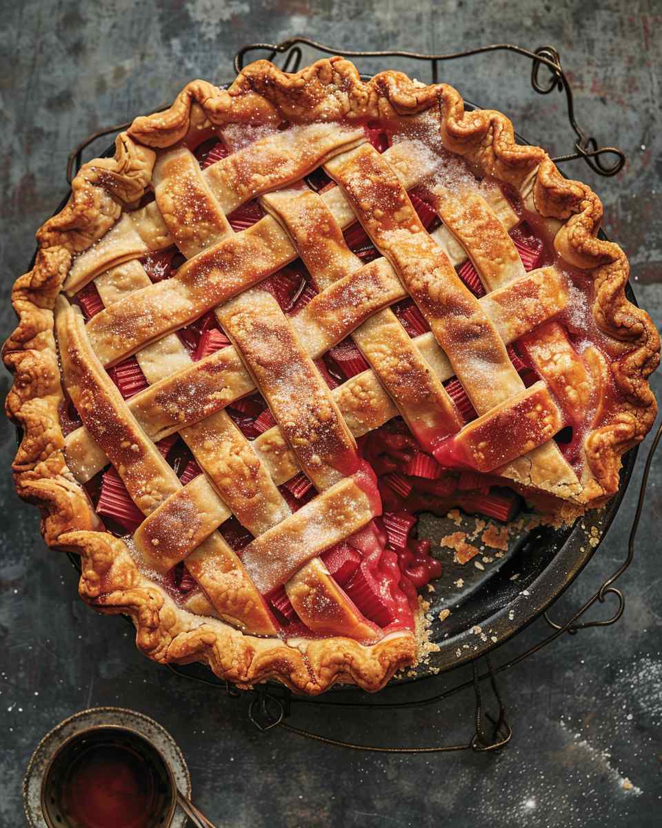 A classic rhubarb pie with a perfect balance of tart and sweet flavors, featuring a jammy filling encased in a flaky golden crust.