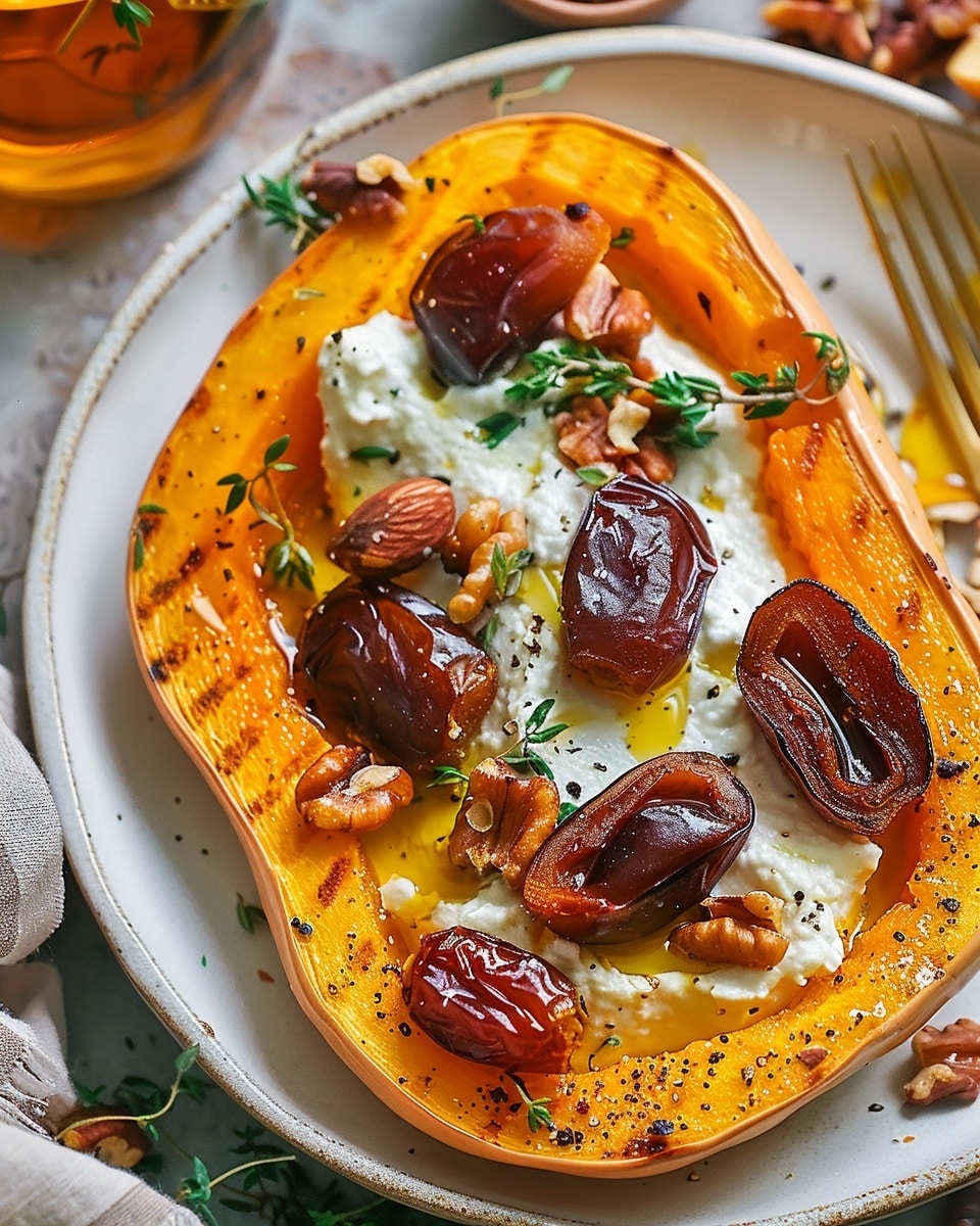 Roasted Butternut Squash with Honey Labneh, Dates, and Hazelnuts