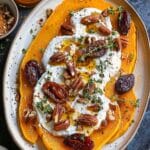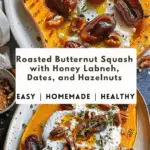 This Roasted Butternut Squash with Honey Labneh, Dates, and Hazelnuts is a stunning fall side dish that’s both elegant and easy to make. Creamy labneh sweetened with honey is topped with caramelized butternut squash, chewy Medjool dates, and toasted hazelnuts for the perfect balance of savory, sweet, and crunchy textures. A beautiful dish for holidays or cozy dinners.