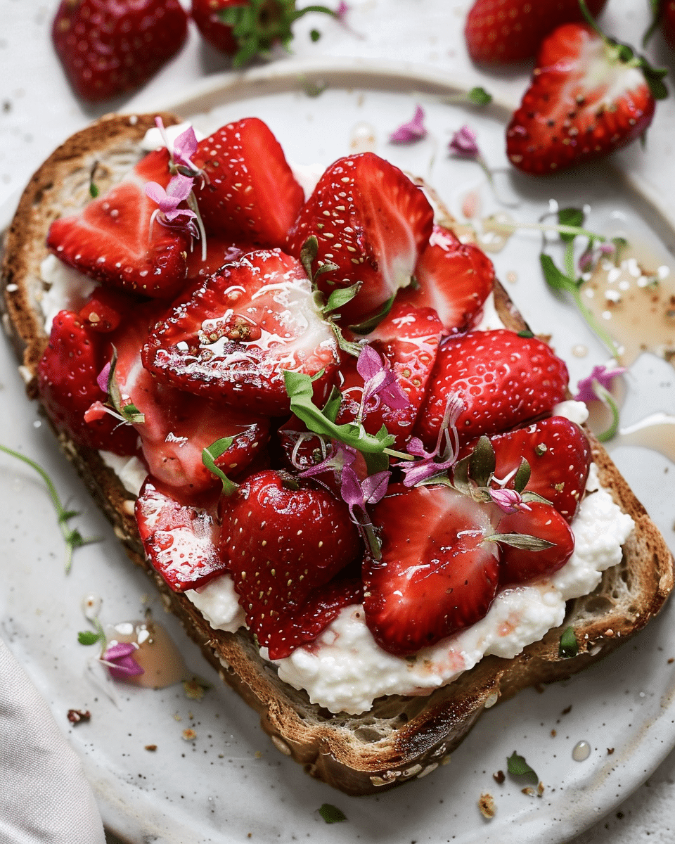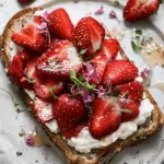 This Roasted Strawberry Whipped Ricotta Toast is a deliciously elegant breakfast or brunch option. Juicy strawberries roasted to a jammy consistency are layered over smooth, creamy whipped ricotta on toasted crusty bread, topped with optional herbs or honey for a fresh, satisfying dish.