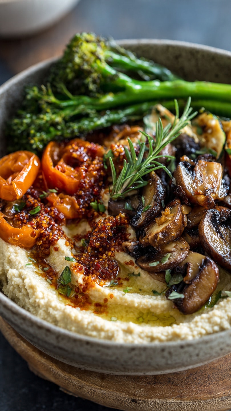 I love how customizable and satisfying this bowl is. It’s packed with plant-based protein and fiber, thanks to the hummus and vegetables. I can use whatever seasonal veggies I have on hand, and the umami-rich mushrooms bring a depth that makes this dish hearty and filling. Whether I serve it warm or room temperature, it always feels like a wholesome, restaurant-worthy meal.
