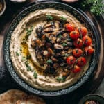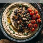The Roasted Vegetable & Mushroom Hummus Bowl is a vibrant and nourishing vegan meal featuring creamy hummus topped with savory roasted veggies and mushrooms. It’s wholesome, satisfying, and bursting with flavor and texture.