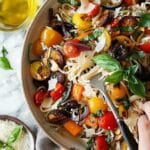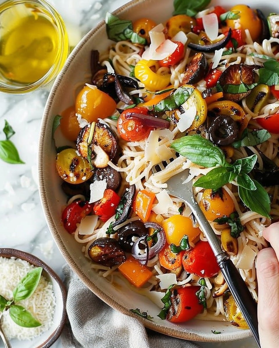 A comforting and colorful pasta dish made with tender pasta and caramelized roasted vegetables, finished with parmesan cheese and fresh basil for a wholesome and flavorful meal.