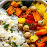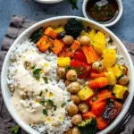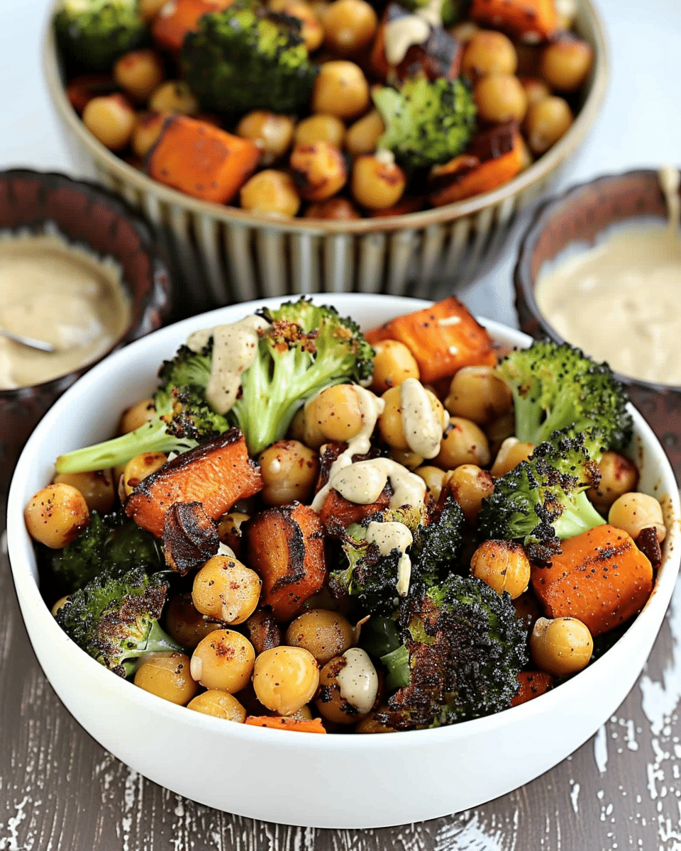 - Assemble bowls by layering grains, roasted veggies, and chickpeas. Drizzle with dressing.