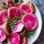 Roasted watermelon radishes are a colorful and elegant side dish with tender texture and a mellow, slightly sweet flavor. Roasting softens their peppery bite while preserving their vibrant pink centers, making them both beautiful and delicious.