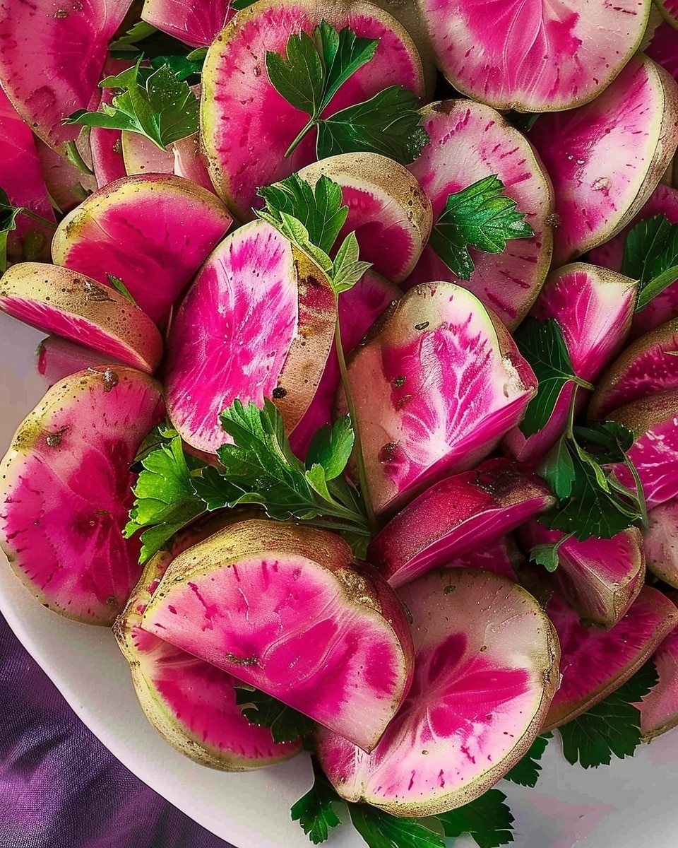 I love making roasted watermelon radishes when I want a colorful side dish that feels both simple and special. Their vibrant pink centers and pale green edges always catch my attention, and roasting them transforms their sharp bite into a mellow, slightly sweet flavor. I enjoy serving them alongside roasted meats, grain bowls, or even as a unique addition to salads.