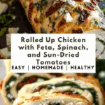 Rolled Up Chicken with Feta, Spinach, and Sun-Dried Tomatoes is a Mediterranean-inspired baked chicken recipe that’s both elegant and easy to make. Juicy chicken breasts are stuffed with a savory filling of feta, sautéed spinach, and sun-dried tomatoes, then rolled and baked to perfection. A beautiful, healthy dinner perfect for any night of the week or special occasions.