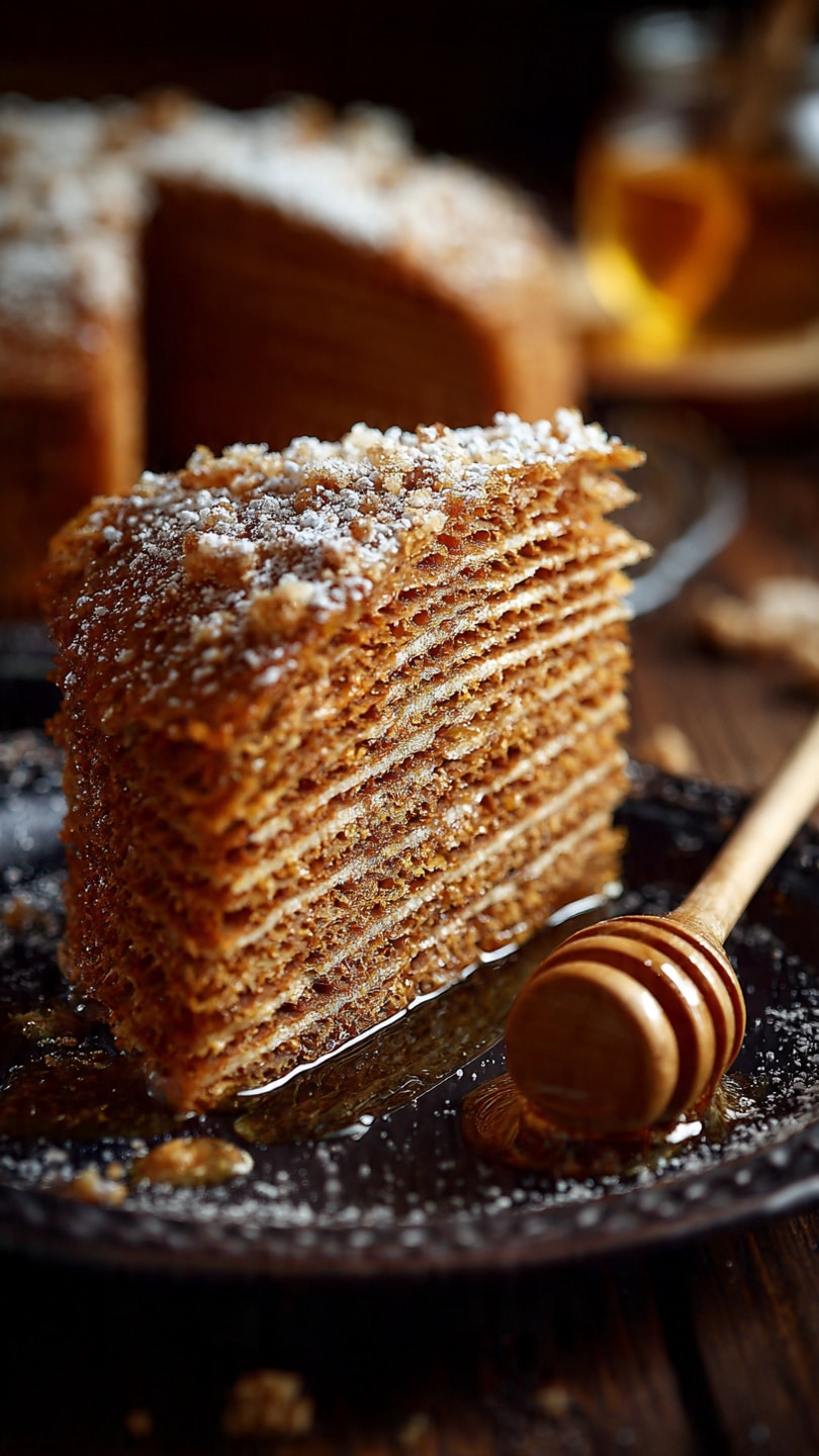 Russian Honey Cake (Medovik) is a stunning multi-layered dessert made with soft honey-flavored cake layers and a light, tangy cream filling. The cake becomes tender as it chills, offering a rich, balanced flavor perfect for special occasions.