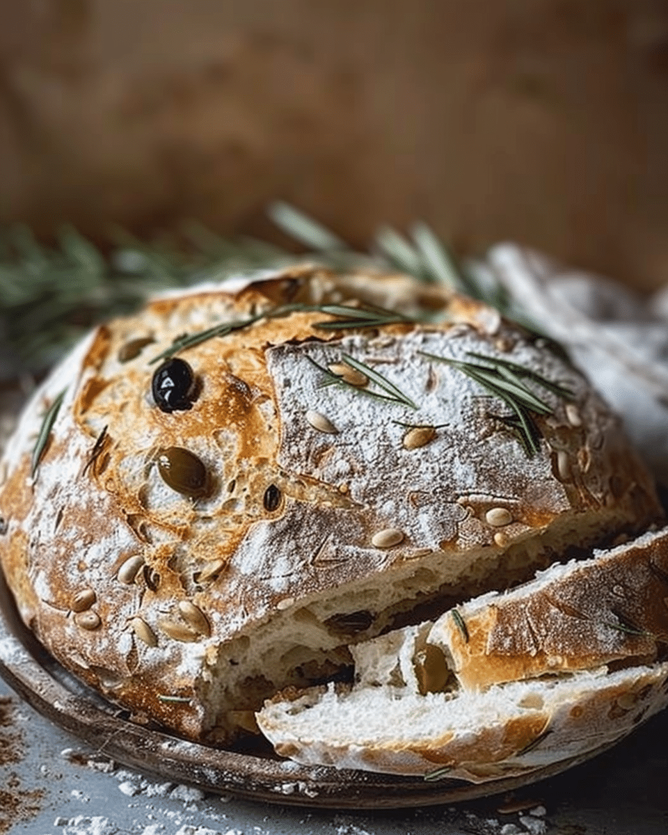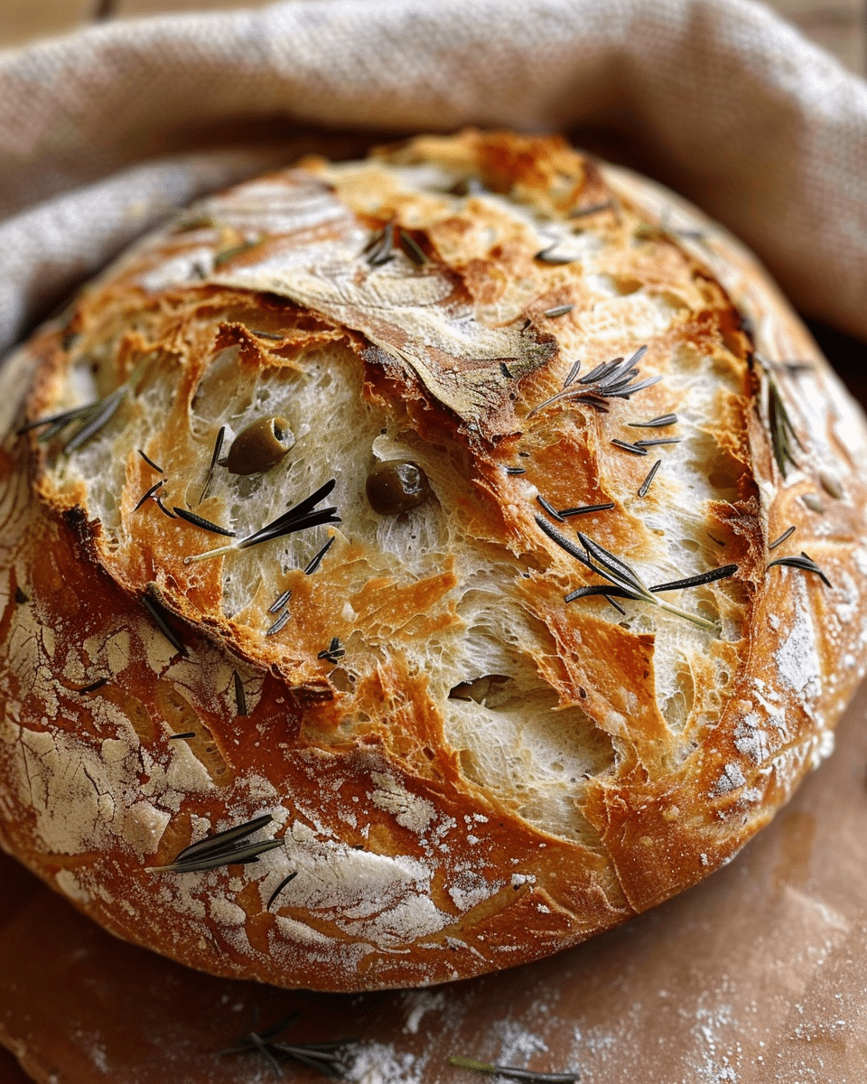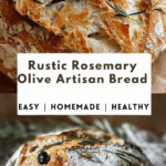 This Rustic Rosemary Olive Artisan Bread is a no-knead, bakery-style loaf with a crisp crust, soft interior, and flavorful bursts of rosemary and olives. Perfect for dipping, toasting, or pairing with soups and pasta.