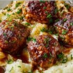 Juicy Salisbury steak meatballs simmered in rich brown gravy and served over creamy garlic herb mashed potatoes. This hearty, comforting dinner is packed with savory flavor and perfect for a satisfying weeknight meal.