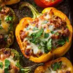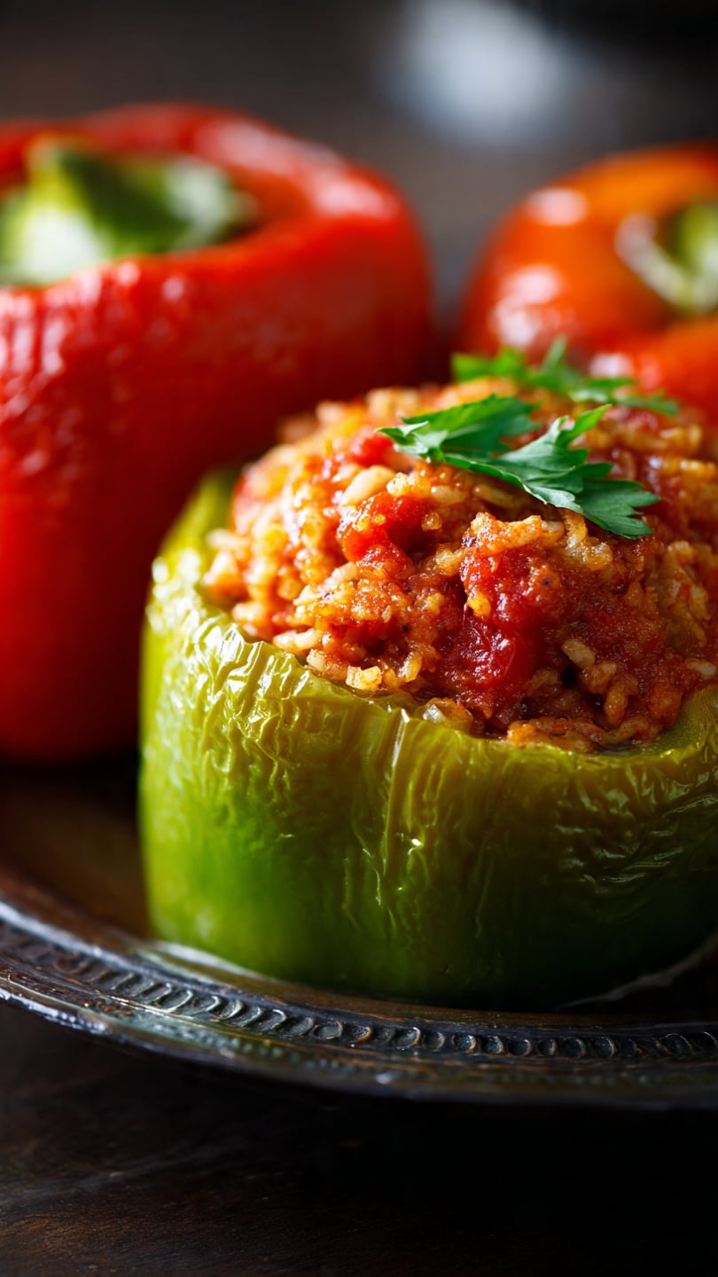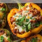 Tender bell peppers filled with a savory sausage and rice mixture, baked until perfectly soft and topped with melted mozzarella and parmesan for a hearty, comforting meal.