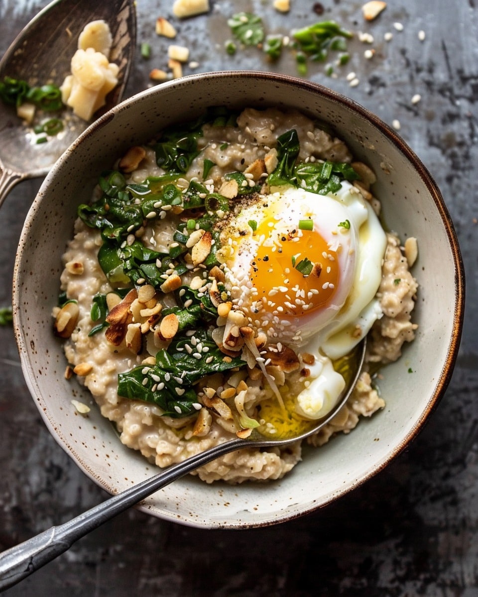 Creamy savory oatmeal topped with a perfectly poached egg, fresh ginger, and sesame for a warm, nourishing meal that works any time of day.