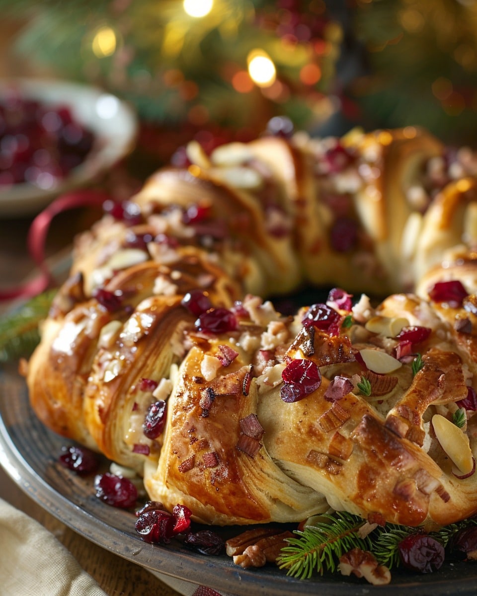 A festive and comforting crescent ring filled with savory turkey, creamy cheese, and sweet cranberry sauce, all wrapped in a flaky golden crust perfect for sharing.