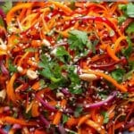 I use a vegetable peeler and run it down the length of each carrot to create ribbons. A mandoline or spiralizer works too, just make sure the pieces aren’t too thick.