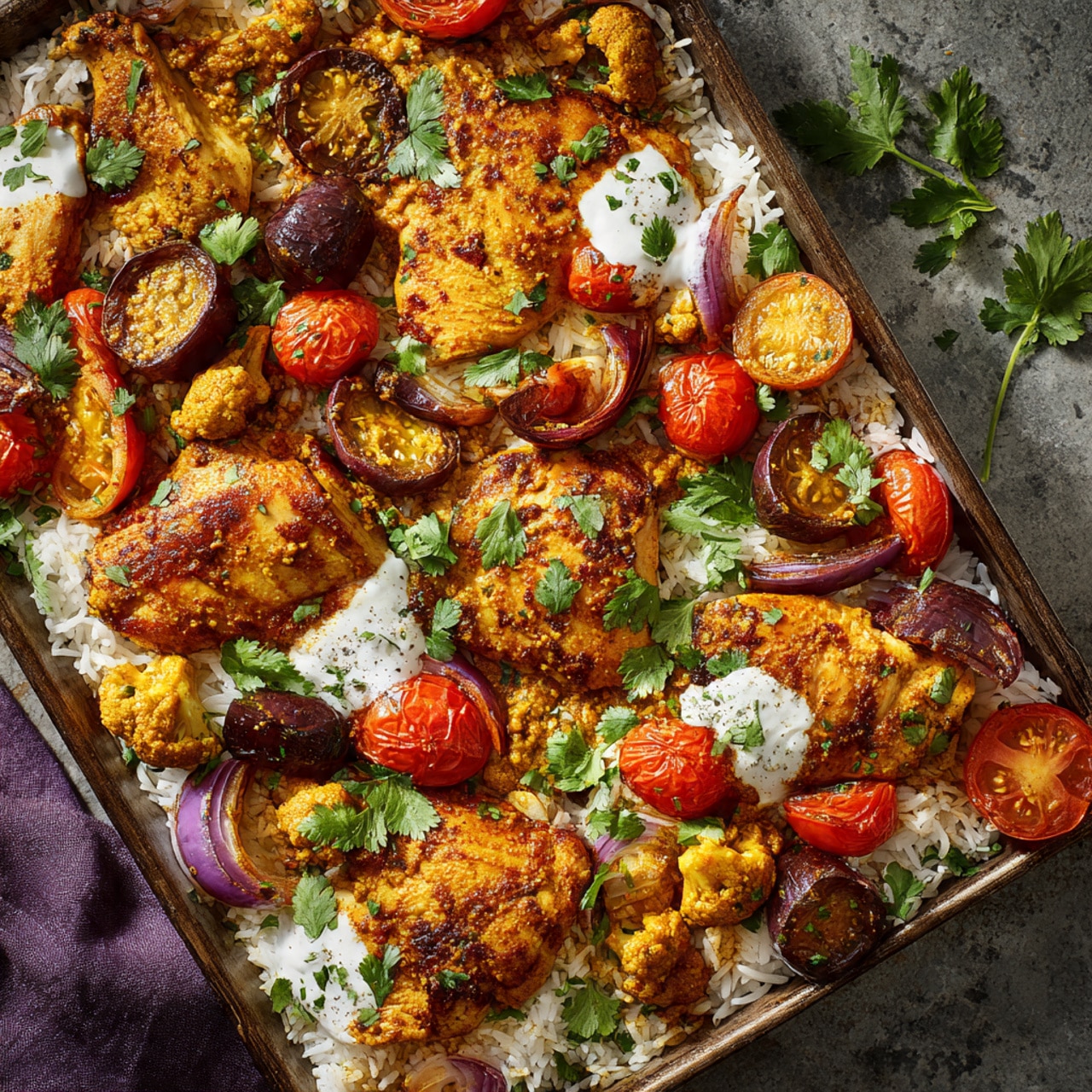 A bold and comforting sheet pan curry chicken with roasted vegetables, coated in warm aromatic spices and finished with fresh lemon for a flavorful one-pan dinner.
