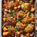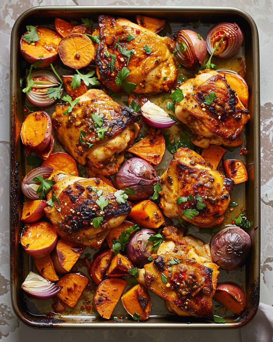 A bold and satisfying one-pan meal featuring juicy roasted chicken and caramelized sweet potatoes coated in smoky, spicy harissa. Easy to prepare, full of flavor, and perfect for busy weeknights with minimal cleanup.