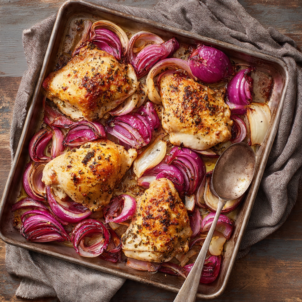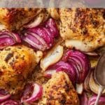 A simple and flavorful sheet-pan dinner featuring juicy roasted chicken cooked over sweet, caramelized red onions for a comforting and satisfying meal.