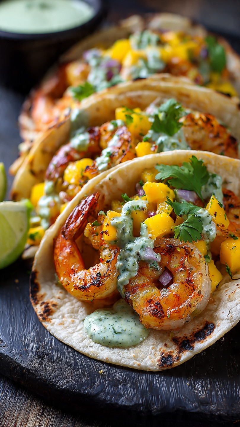 These Shrimp Tacos with Mango Salsa and Creamy Cilantro Sauce are a vibrant and flavorful meal featuring seasoned shrimp, sweet mango salsa, and a cool, zesty cilantro sauce all wrapped in warm tortillas—perfect for a quick dinner or party dish.