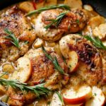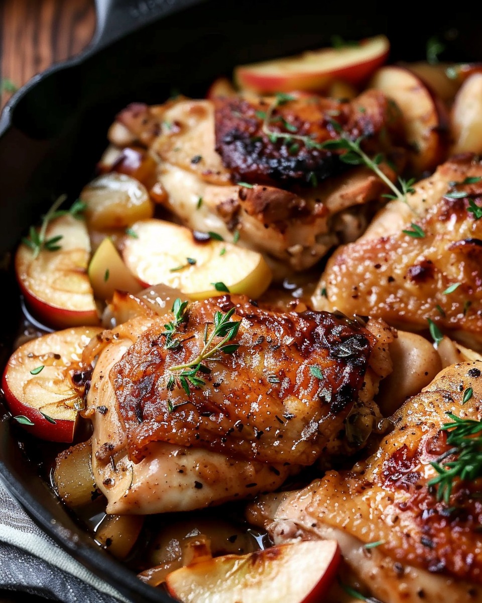 A cozy one-pan skillet chicken dish simmered in a savory-sweet apple cider sauce with tender apples and herbs, perfect for an easy yet flavorful dinner.