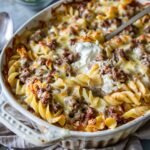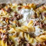 A comforting, old-fashioned sour cream beef noodle casserole made with tender egg noodles, savory ground beef, and a creamy, cheesy sauce baked until bubbly and satisfying.