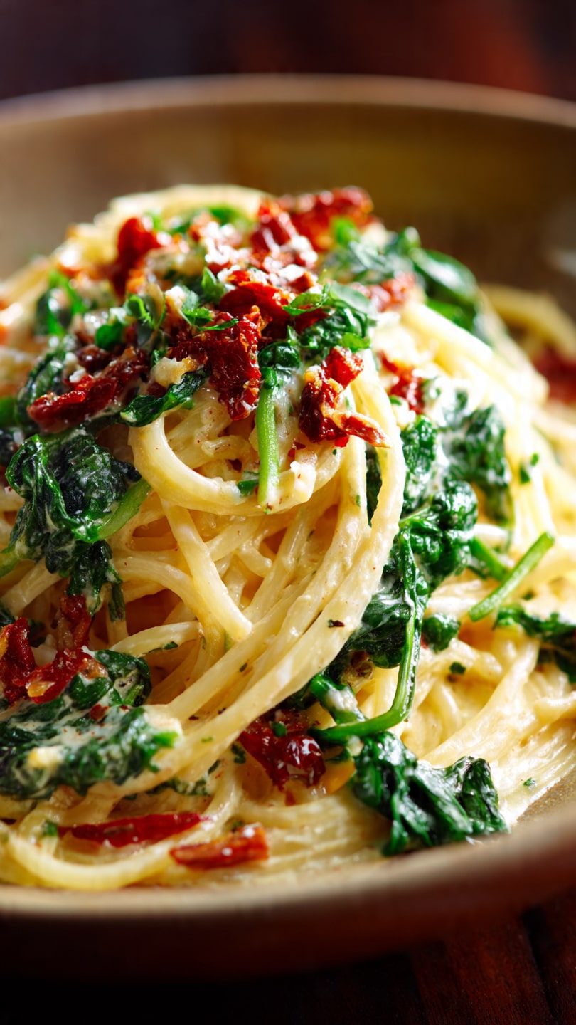 Spaghetti & Spinach with Sun-Dried Tomato Cream Sauce is a rich, savory pasta dish featuring creamy garlic-Parmesan sauce, tangy sun-dried tomatoes, and fresh spinach. Ready in under 30 minutes, it’s the perfect comfort food for weeknights or cozy dinners.