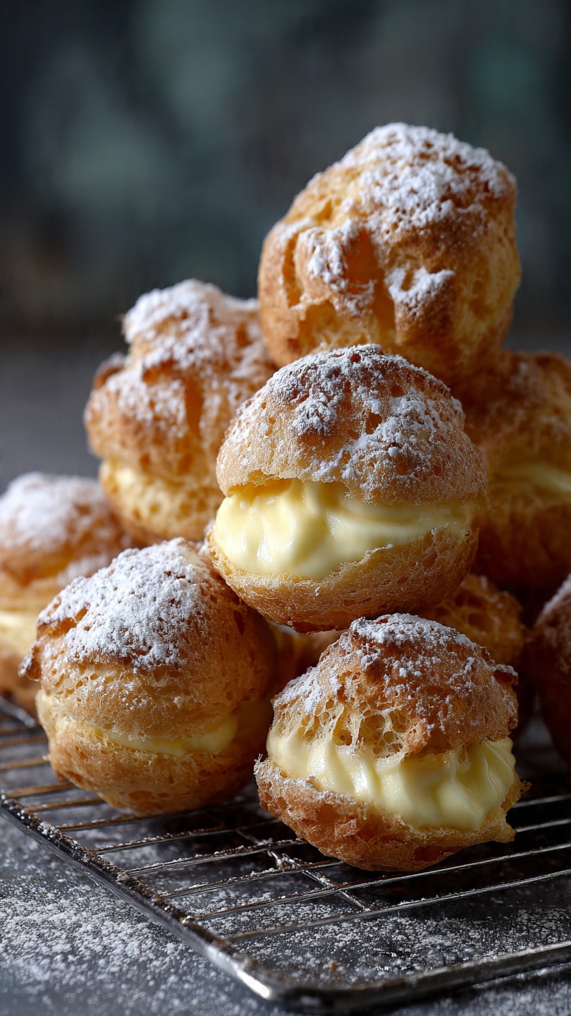 Delicate Italian cream puffs filled with rich vanilla custard. These airy pastries have a golden, crisp shell and a smooth, creamy center—perfect for celebrations or an elegant homemade dessert.