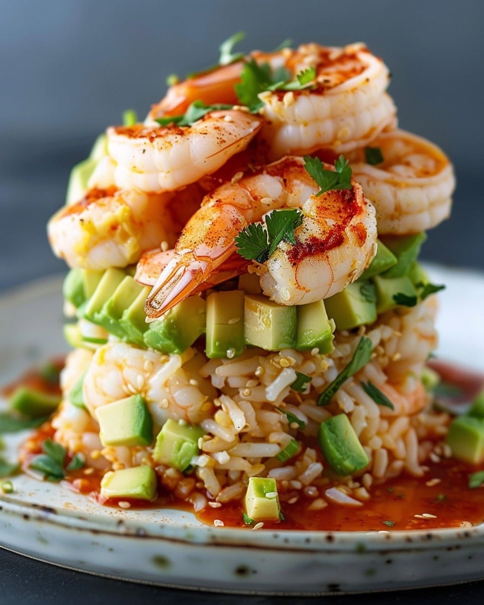 Spicy California shrimp stack is a sushi-inspired layered dish featuring seasoned rice, creamy avocado, spicy shrimp, crisp cucumber, and optional imitation crab. Topped with spicy mayo and garnishes, it’s a fresh, flavorful, and no-roll take on your favorite sushi flavors.