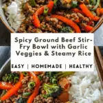 A bold and flavorful Spicy Ground Beef Stir-Fry Bowl with garlic veggies and steamy rice. This quick and satisfying all-in-one meal is perfect for busy weeknights and delivers balanced heat, savory-sweet flavors, and a variety of textures.