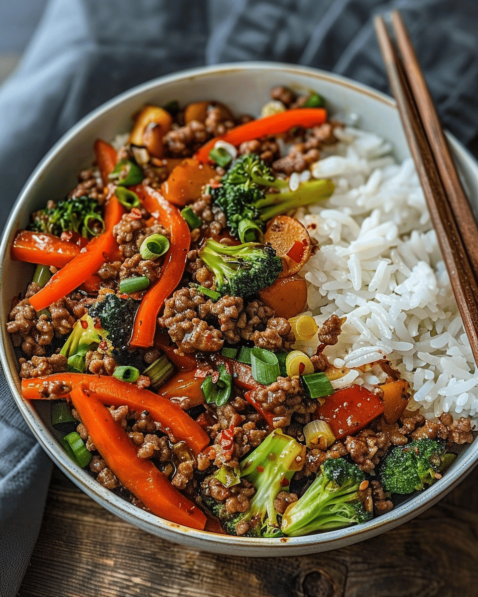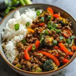 This Spicy Ground Beef Stir-Fry Bowl with Garlic Veggies and Steamy Rice is a quick, bold-flavored meal that’s perfect for busy weeknights. I take tender ground beef, coat it in a spicy-sweet sauce, and pair it with garlicky vegetables and fluffy white rice for a satisfying, all-in-one bowl.