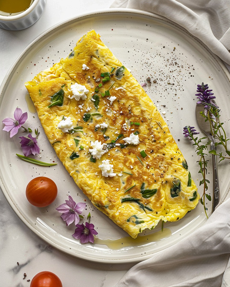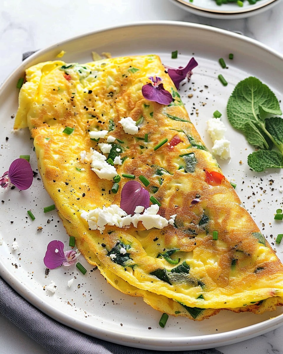 A light and fresh omelet filled with seasonal vegetables, tender greens, and melted cheese, creating a fluffy and flavorful dish perfect for breakfast, brunch, or a quick meal.