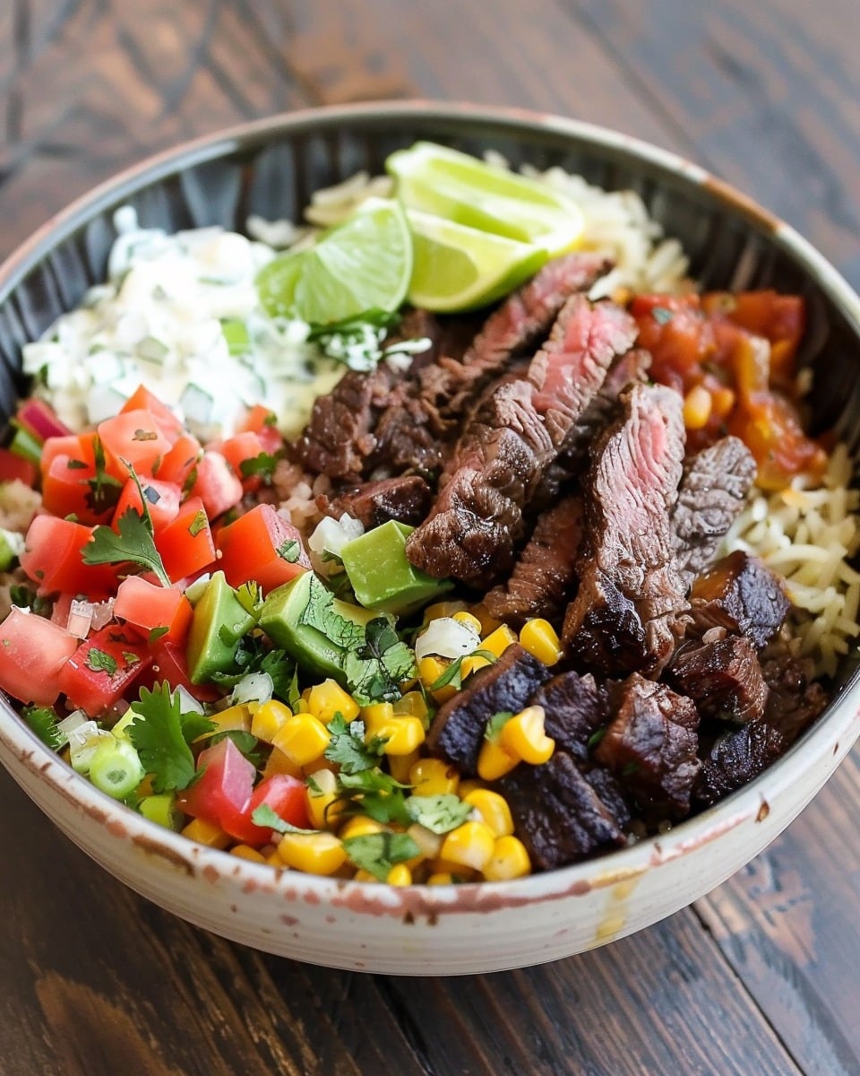 A steak burrito bowl is a deconstructed burrito served in a bowl, packed with juicy marinated steak, fresh vegetables, rice, and beans. It’s a hearty, customizable, and flavorful meal perfect for dinner or meal prep.