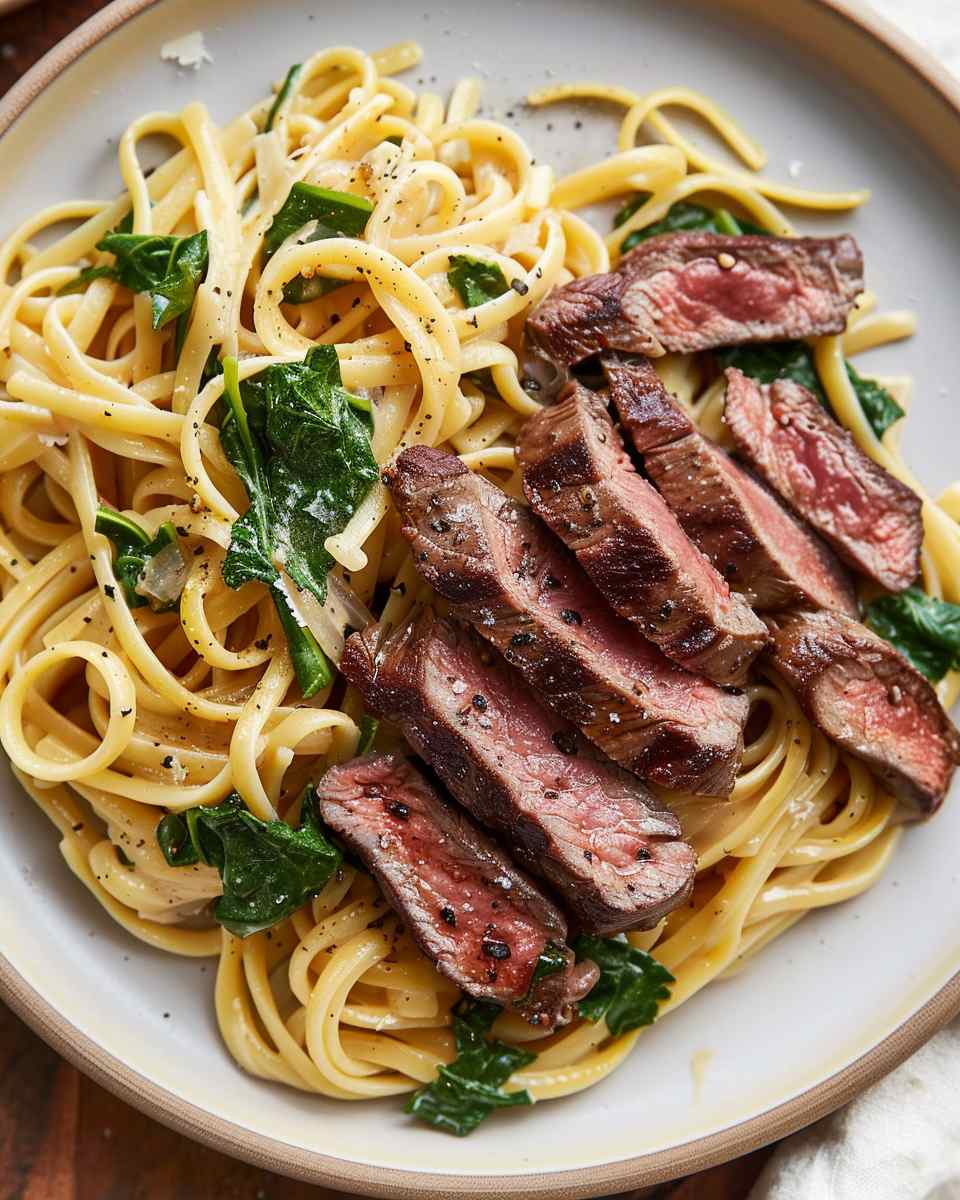 A hearty and indulgent pasta dish featuring tender slices of steak tossed with pasta in a rich, creamy garlic parmesan sauce.