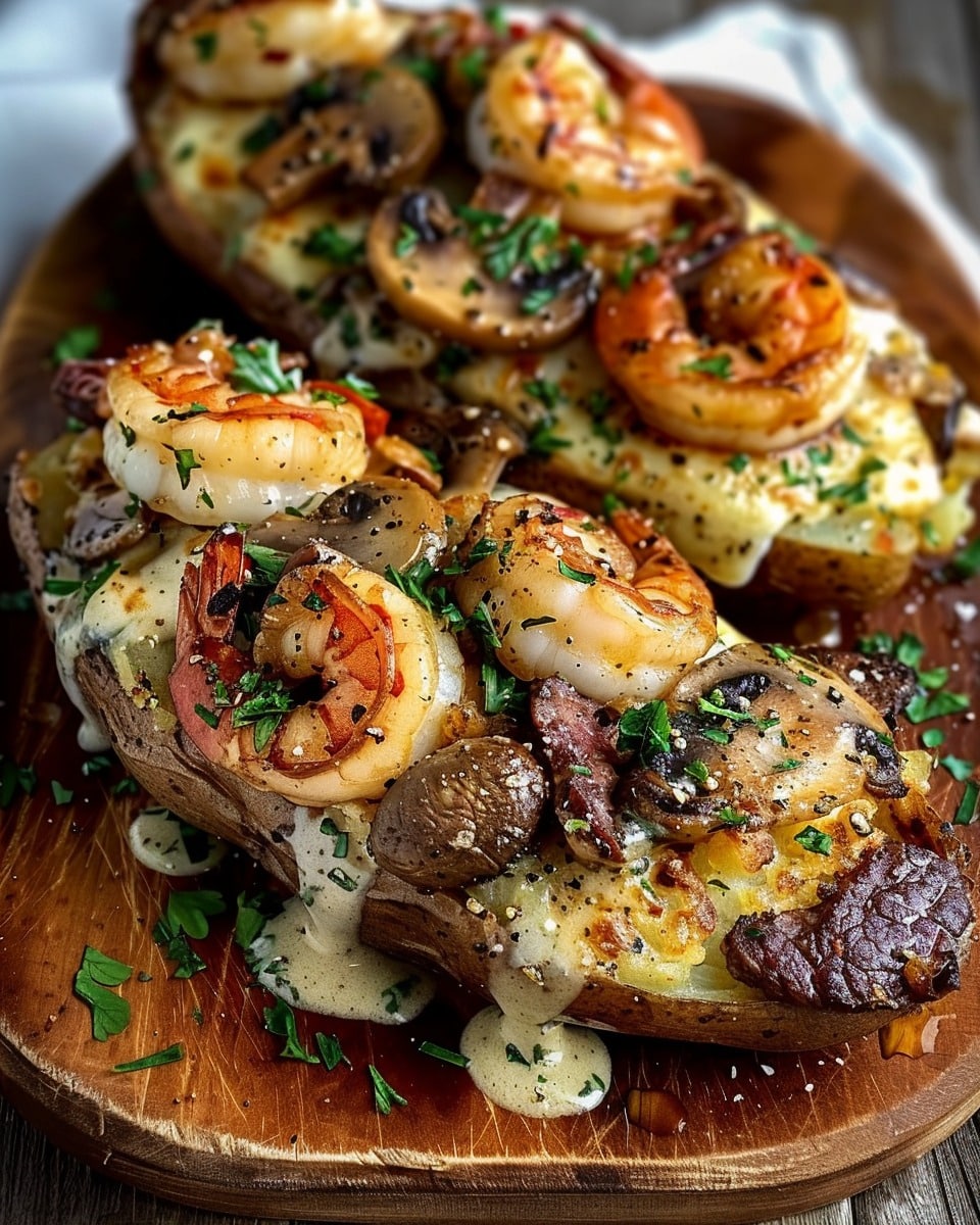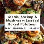 Steak, Shrimp & Mushroom Loaded Baked Potatoes