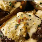 These Steak-Stuffed Baked Potatoes are a comforting, hearty meal featuring crispy baked potatoes filled with tender steak slices, cheddar cheese, sour cream, and chives. Perfect for a cozy dinner or entertaining guests with an all-in-one dish.