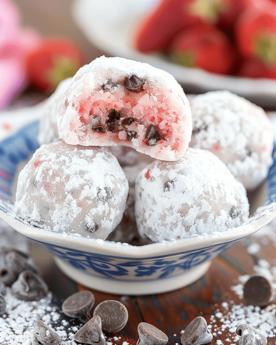 Sometimes I swap the mini chocolate chips for white chocolate chips for a creamier pairing. If I want more strawberry punch, I add a drop of strawberry extract or a pinch of pink food coloring for deeper color. I’ve also rolled them in strawberry-flavored powdered sugar for extra fruitiness.