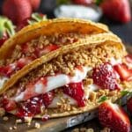 These Strawberry Crunch Cheesecake Tacos are a playful, no-bake dessert packed with creamy cheesecake filling, juicy strawberries, and a nostalgic strawberry crunch topping — all tucked inside a crispy cinnamon-sugar taco shell.