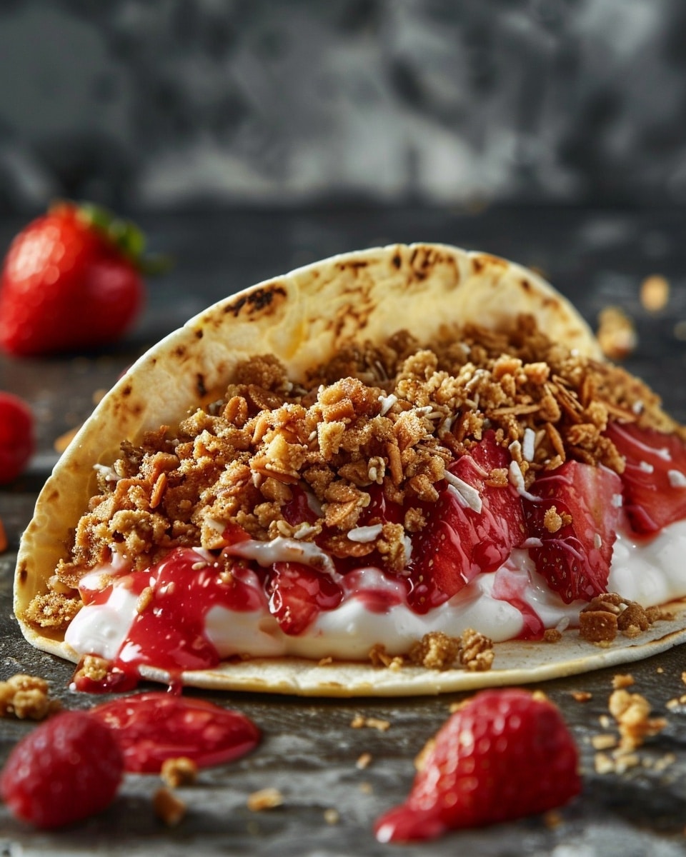I finish by sprinkling each taco with the strawberry crunch topping and chill for 15–30 minutes before serving.