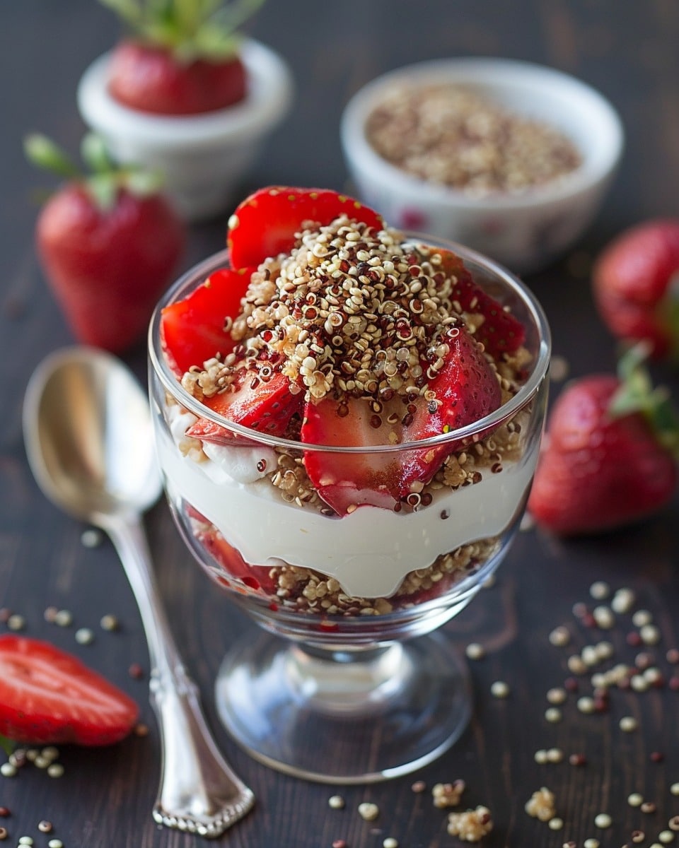 I love how this recipe brings together the hearty, nutty texture of quinoa with the natural sweetness of strawberries. It’s naturally gluten-free, high in plant-based protein, and super easy to prep ahead. I can serve it warm or chilled, and it’s endlessly customizable with different toppings. It’s perfect for spring mornings or anytime I want a fruity, wholesome breakfast.