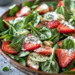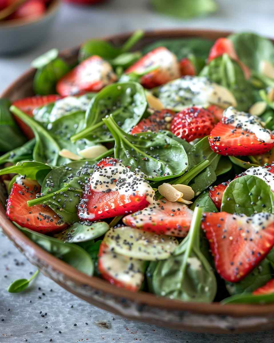 A fresh and vibrant strawberry spinach salad with sweet berries, crunchy nuts, creamy cheese, and a tangy poppy seed dressing.