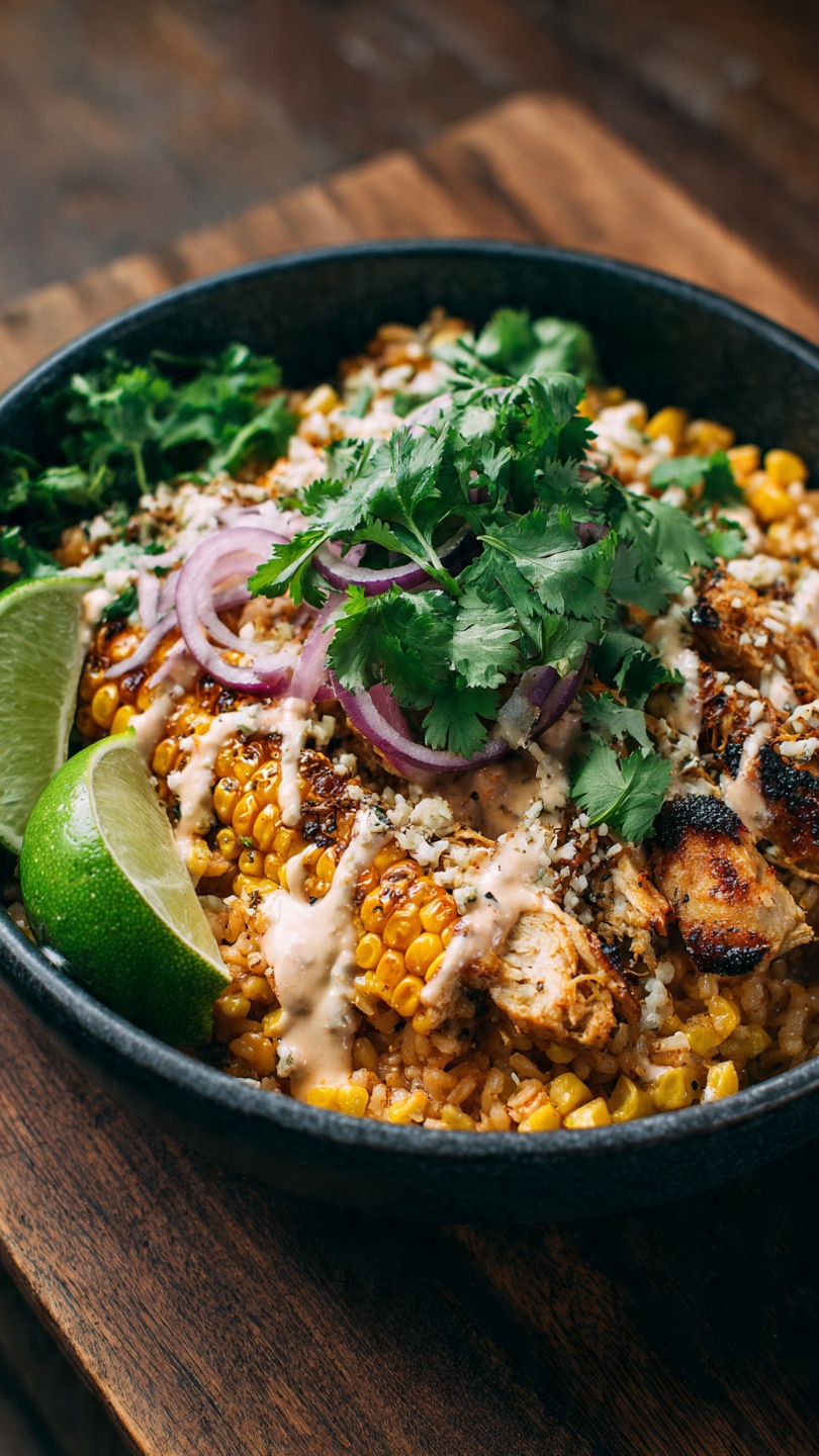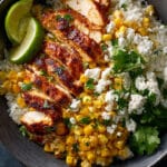 I love this recipe because it’s incredibly customizable and comes together quickly, especially if I already have cooked rice on hand. The chicken is smoky and tender, the corn is creamy with a hint of spice, and everything is tied together with tangy lime and fresh toppings. It feels like street food comfort in a bowl — but made easily at home.